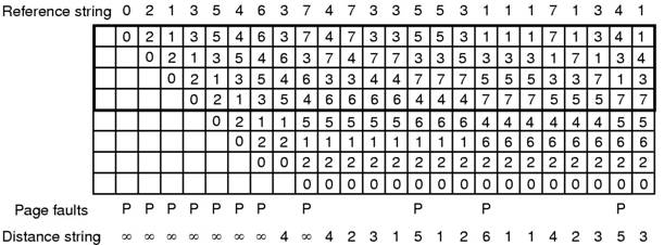4- (Programming question) Write a program (use Unix compatible environment) that simulates a paging system. At the start of program, the user should be asked to choose a page replacement algorithm, choosing from LRU and FIFIO. On each cycle, read the number of referenced page from a file by using appropriate file system calls. Generate a listing similar to following figure, except rotated 90 degrees so that each new page reference increases the length of output file by one line.