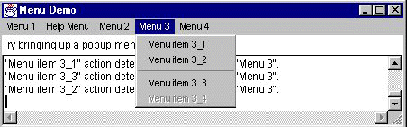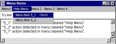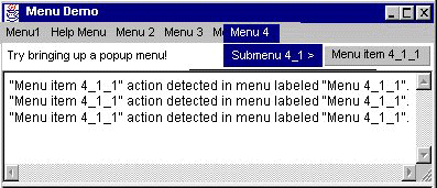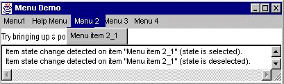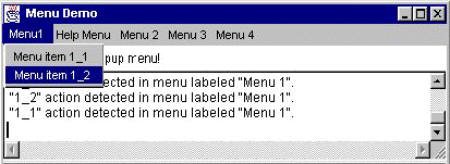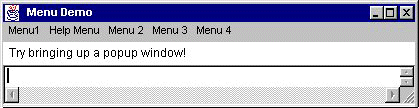 The following applet shows many of the menu features you're likely to use. The window it brings up has a menu bar that contains five menus. Each menu contains one or more items. Menu 1 is a tear-off menu; by clicking the dashed line, the user creates a new window that contains the same menu items as Menu 1. (Currently, tear-off menus are implemented only on the Solaris platform, not in Windows 95/NT or MacOS.) Menu 2's only item has a checkbox. Menu 3 contains a separator between its second and third items. Menu 4 contains a submenu. Menu 5 is the window's help menu, which (depending on the platform) generally means that it's set off to the right. When the user clicks on any menu item, the window displays a string indicating which item was clicked and what menu it's in.