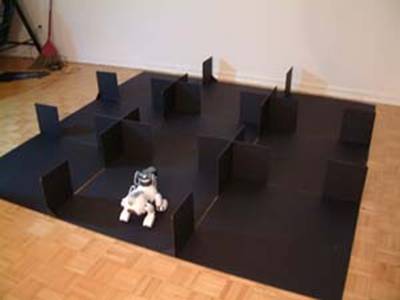 This movie shows the robot going from location (1,1), the top right room in the video, to the location (3,3), the bottom left room in the video, by repeatedly approaching the appropriate doors marked by appropriate color dots.