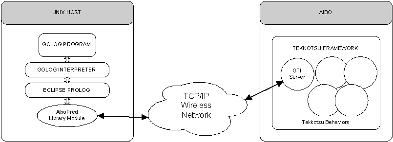 On the client side, there is an external predicate module that can be loaded as a library by the Eclipse Prolog interpreter running on a Unix-based computer. This module, shown as the AiboPred module in the diagram below, provides the Golog interpreter with a predefined set of actions that can be performed to interact with the robot.