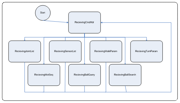 The initial starting state is the ReceivingCmdHdr state, in which the server waits for a TCP command header from the client. Depending on the type of the header it received, the method switches to one of the command body receiving states, in which it waits for the command body of a certain type to arrive from the client. Upon receiving the command body, the server appropriately carries out the command, replies to the client if necessary, and then switches back to the RecieingCmdHdr state.